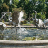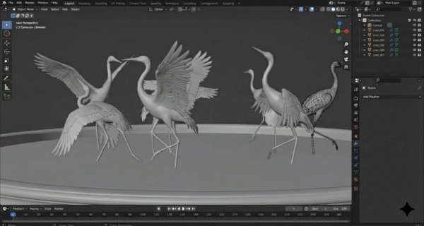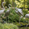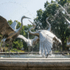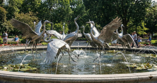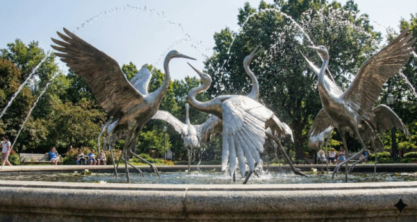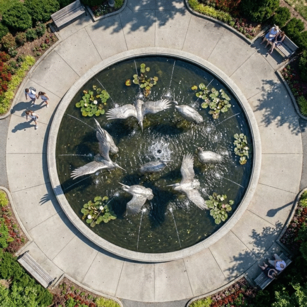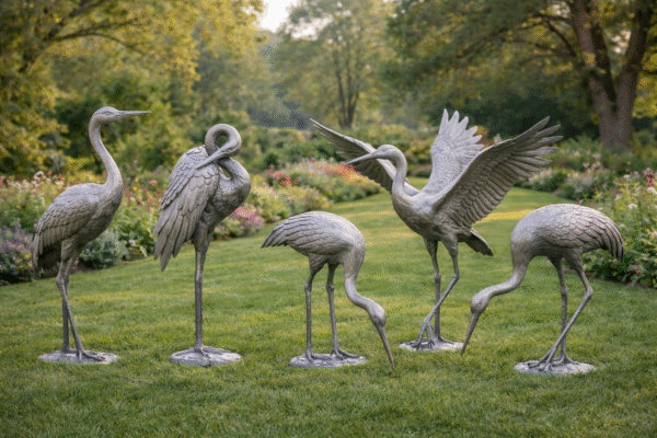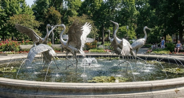 Each crane is individually designed with a distinct posture—leaping, landing, or spreading its wings—creating a sense of rhythm and natural movement. Integrated fountain outlets allow water to flow directly from the sculpture, enhancing realism and interaction with the surrounding space.