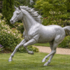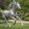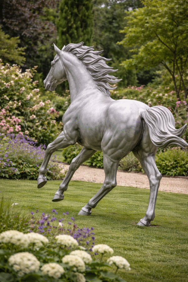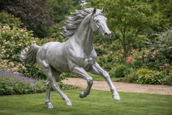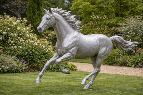 The horse is sculpted in mid-motion, symbolizing freedom, vitality, and forward momentum. Its flowing mane and muscular form are carefully shaped to create a sense of realism while maintaining an elegant artistic abstraction. The balanced proportions ensure the sculpture remains powerful without appearing heavy, allowing it to blend harmoniously into both modern and classical environments.