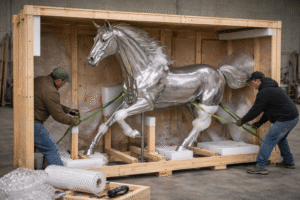 Each sculpture is carefully packed using protective materials and a reinforced wooden crate to ensure safe international transportation.