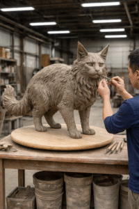 • Step 1: The Soul (Hand Sculpting)Every piece begins as a lump of clay. Our master artists spend weeks meticulously carving the original model by hand. As seen in our process photos, every tuft of fur, the muscle definition in the shoulder, and the intensity of the eyes are sculpted to perfection before any metal is poured.