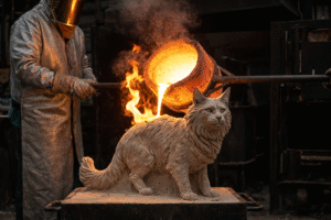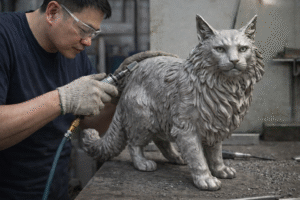• Step 3: The Cast & Finish (Chasing)Molten stainless steel is poured into the shell, replacing the wax. Once cooled, the shell is broken away to reveal the raw metal. Our artisans then spend days on “chasing”—grinding, welding, and re-texturing the surface to ensure the fur looks soft and flows naturally, removing any casting imperfections.