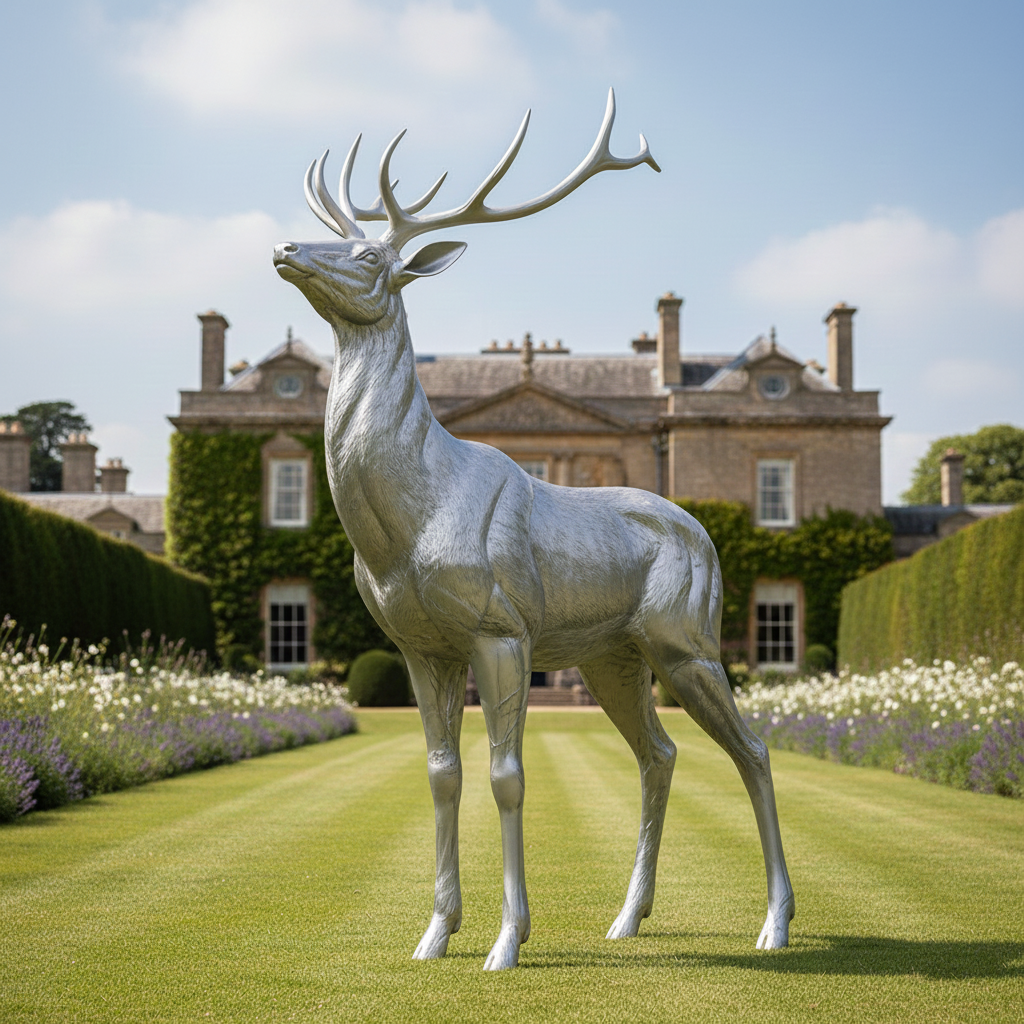 Standing tall on a manicured lawn, the stainless steel deer sculpture rises with calm authority. Its head lifted, antlers extending confidently into the sky, the sculpture reflects a moment of quiet dominance — a balance between nature, order, and refinement.