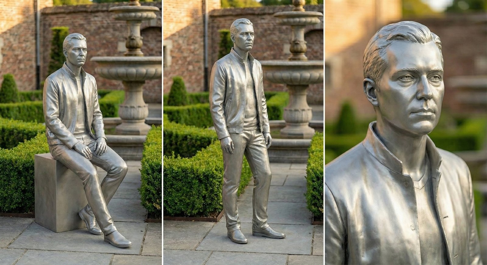 Presented in three perspectives — seated, standing, and close-up — this stainless steel human sculpture captures a modern individual in moments of calm presence. Neither heroic nor exaggerated, the figure reflects realism, restraint, and quiet confidence.